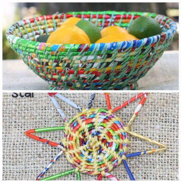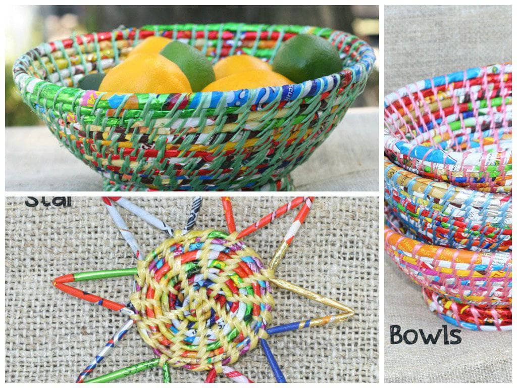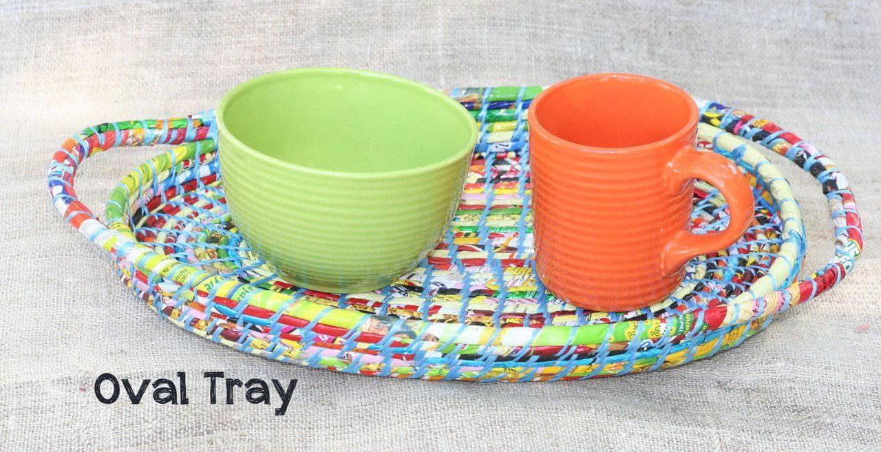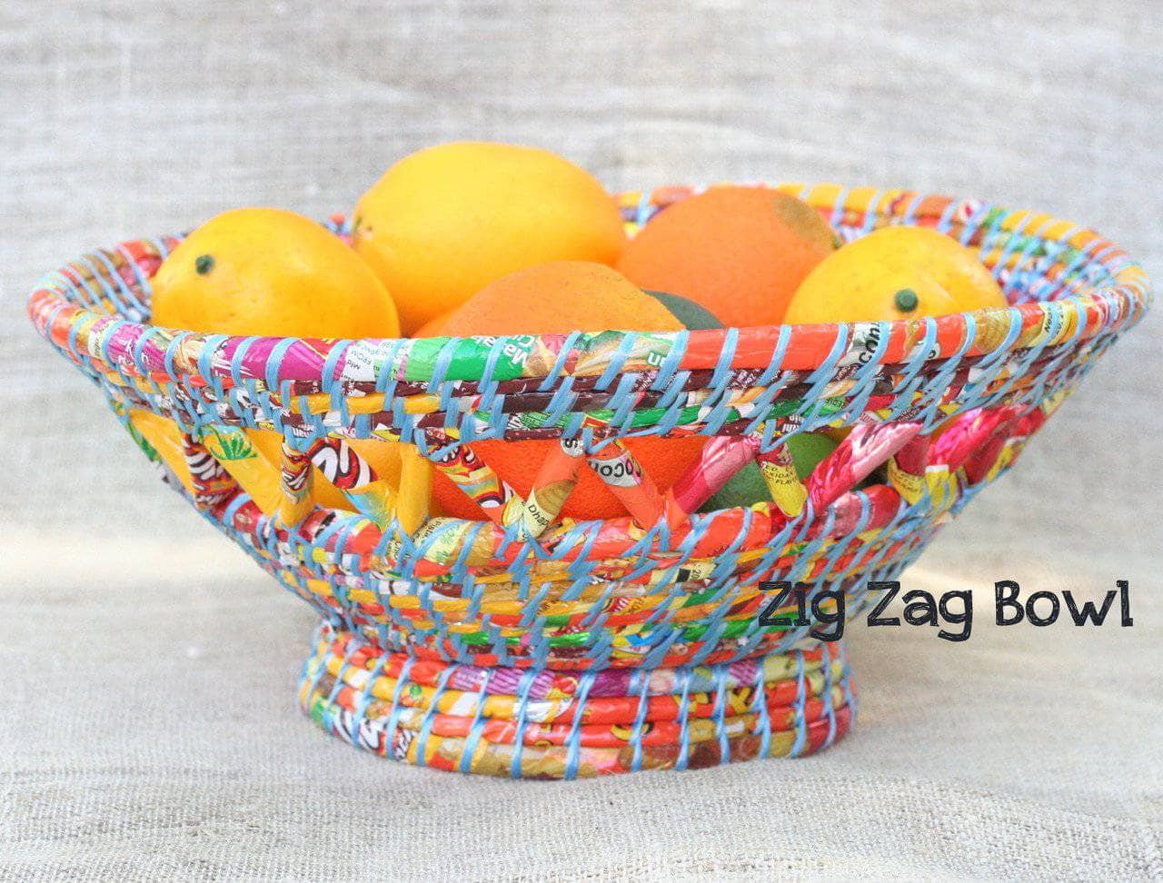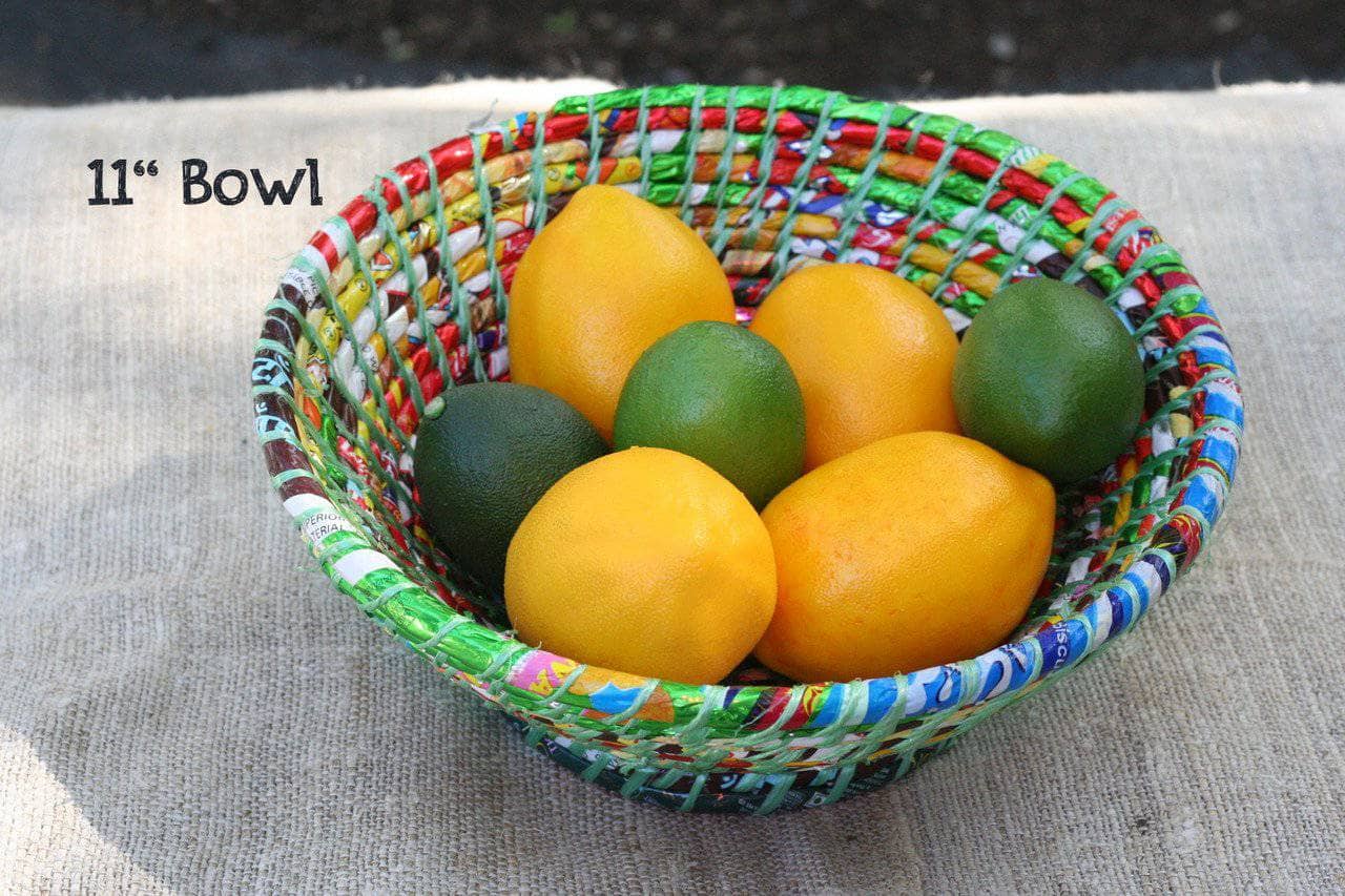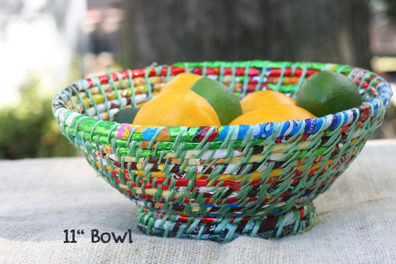 These handwoven baskets can act as both a fruit bowl and a serving tray in your home. This basket is handmade by the women in our co-ops in India from recycled waste they find in their communities. Each basket, bowl, and serving tray is durable to hold heavy items, and is even waterproof.