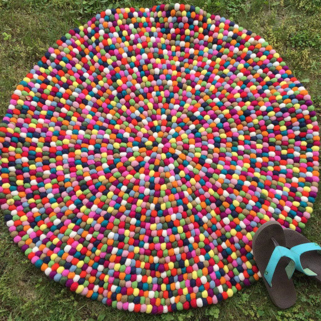 Truly amazing! Customers may be familiar with our very unique felt ball yarn but how cool is this rug? The felt balls are hand sewn to make this amazing rug. This may jazz up your office space or perhaps you want this to add some pizazz to the kids room? With its bright arrary of colors, it fits everywhere and will be the attention getter, for sure. This felt ball rug brings a rainbow of fun to you!