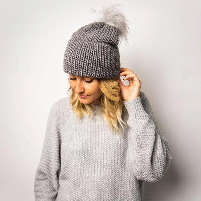 Knit Double Brimmed Hat - Light grey hat with a faux fur pom pom. Made with 100% acrylic yarn.