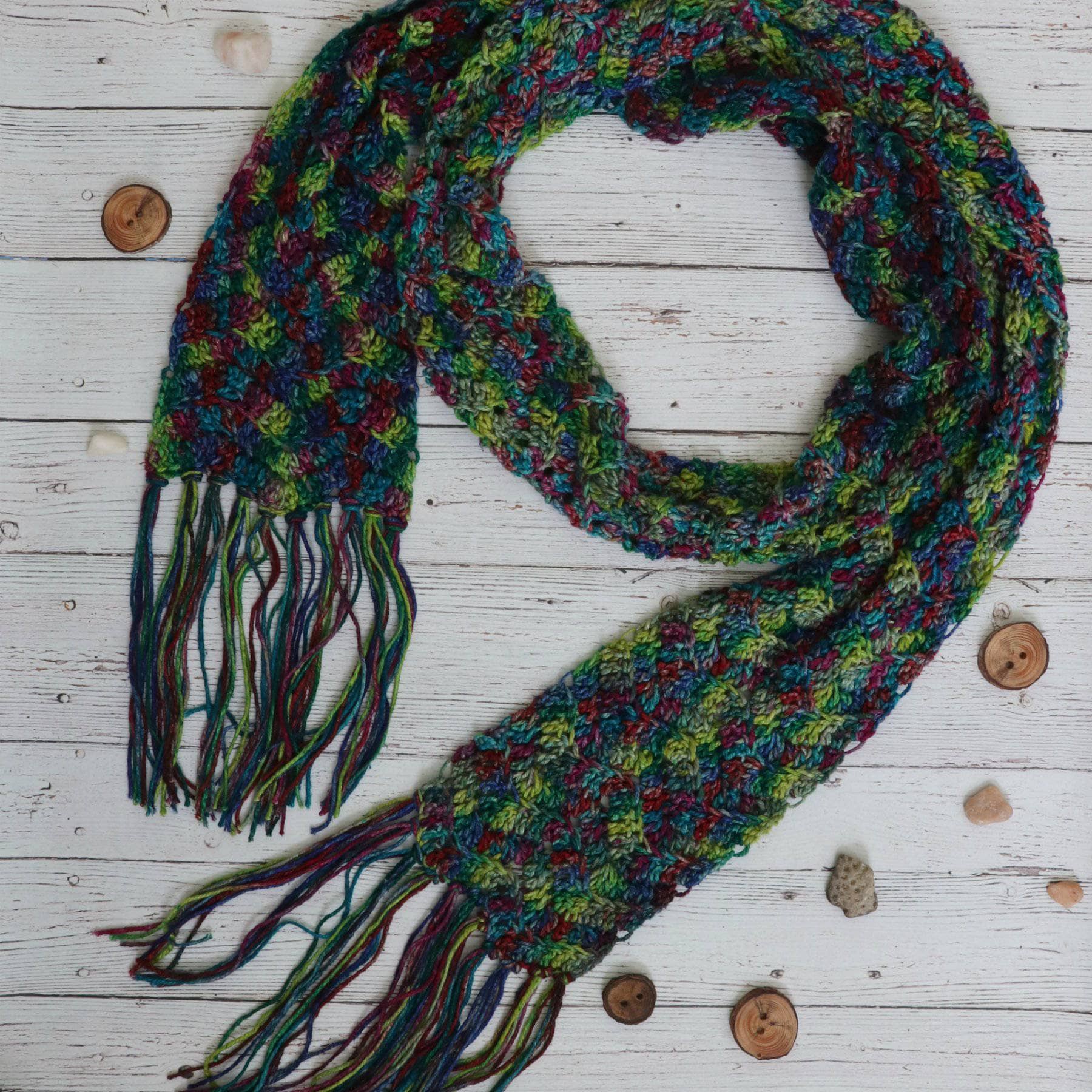 Available in 4 different colors, this beautiful & easy crochet scarf pattern is made from our soft & luxurious silky baby 3 ply recycled silk yarn.