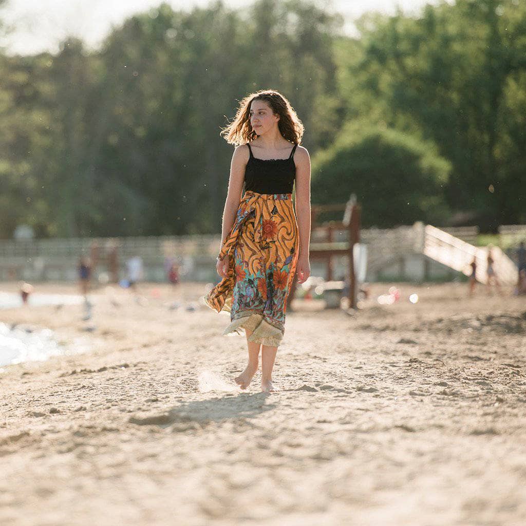 Each skirt is handmade by our co-ops in India out of recycled saris and turned into the beautifully finished skirt you see. With your help, these artisans are able to sustain year-round employment. We will try our best to match color requests however since this is our discount mystery skirt, we may not be able to accommodate all requests.