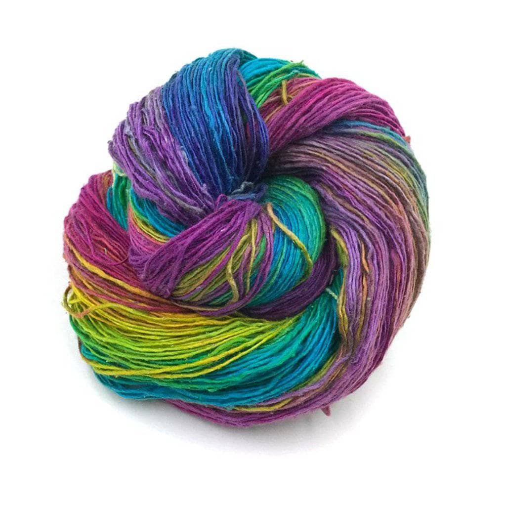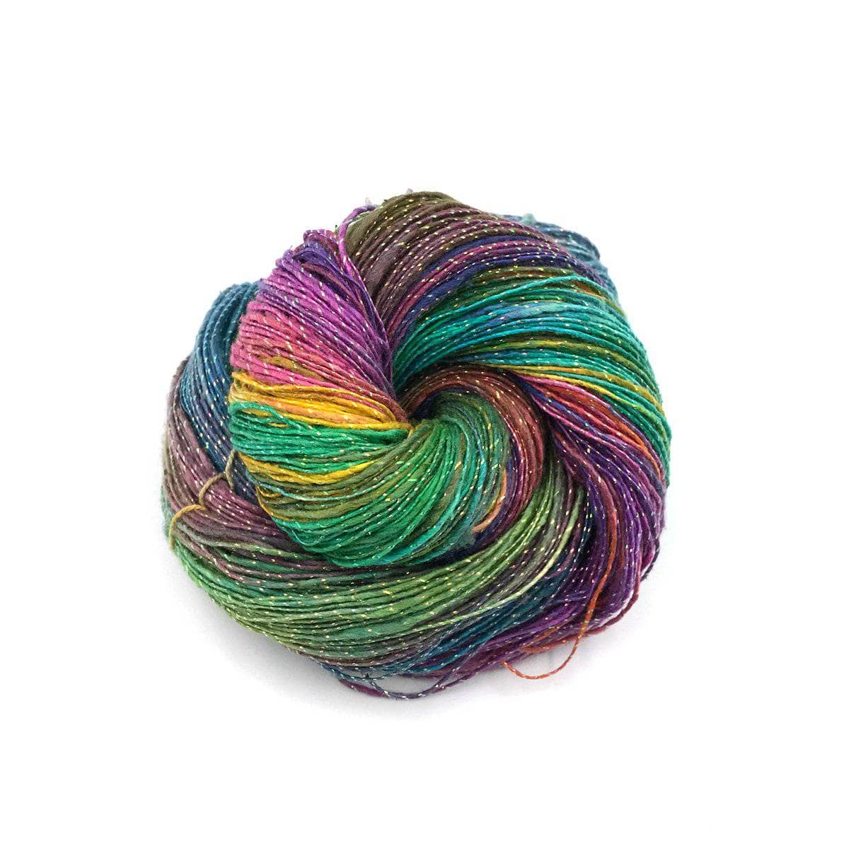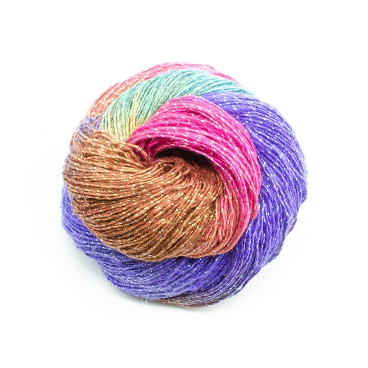 This Recycled silk yarn is full of playful spirals of color, creating a balance between fun and delicate! Soft and light, this yarn is perfect for any lightweight project on your to-do list.