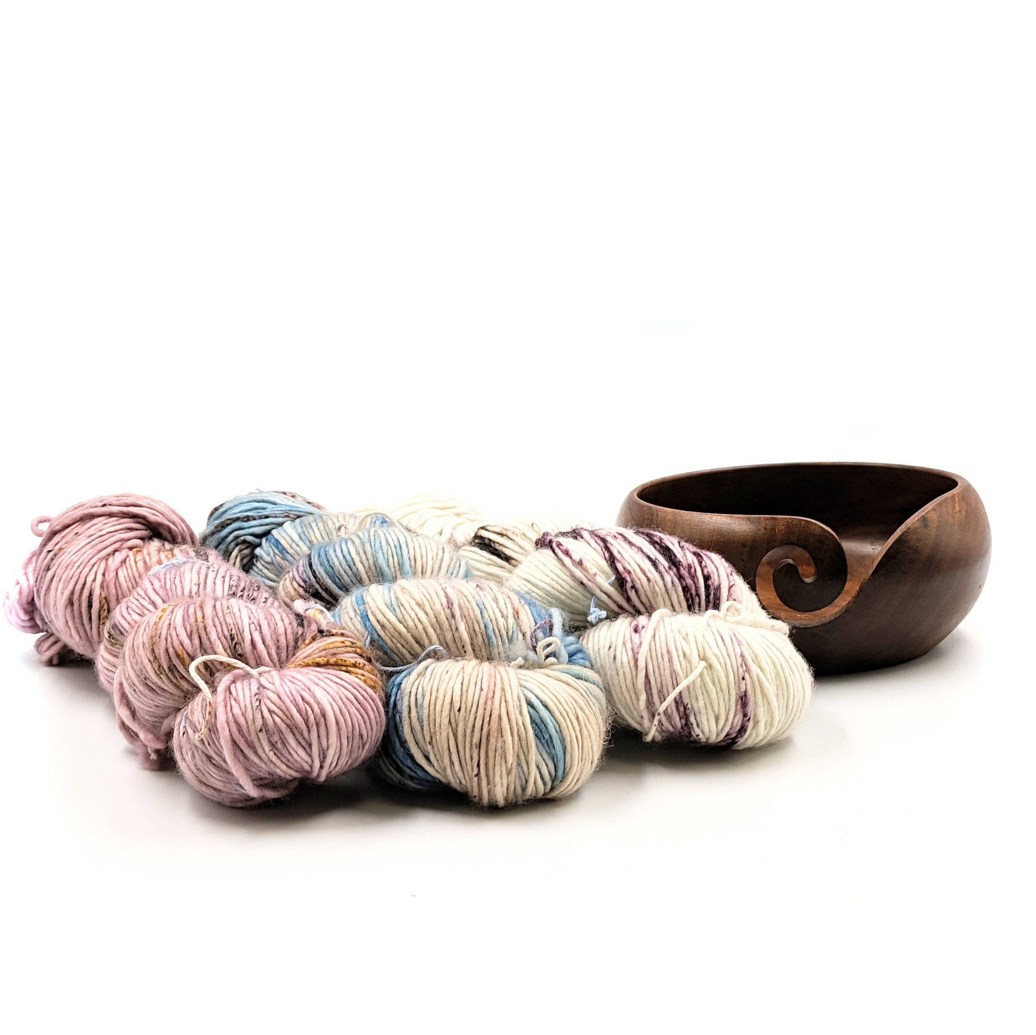 3 Pack + Yarn Bowl: This pack includes 1 skein of Star Scatter, Good Silence, Night in Chile and a handmade wooden yarn bowl