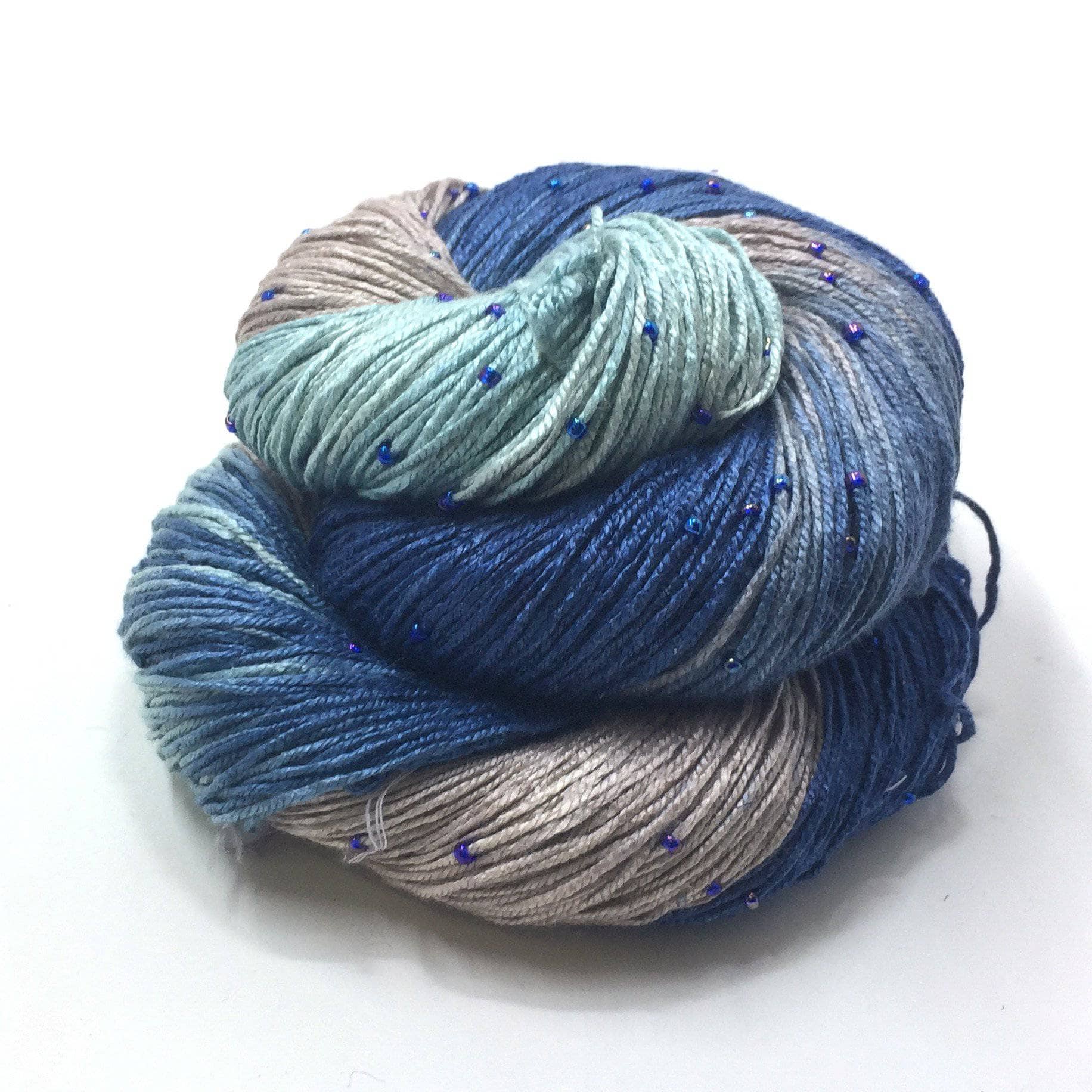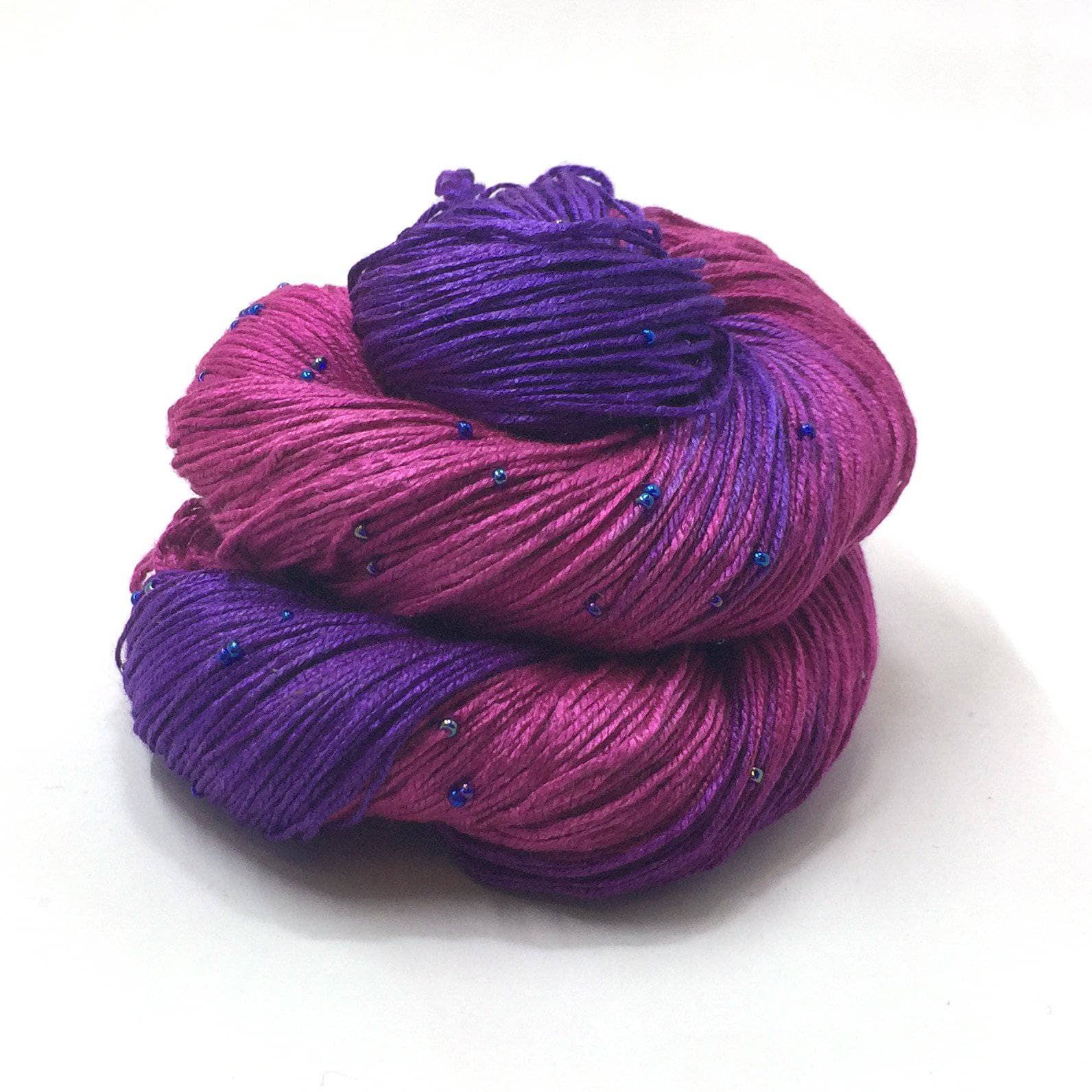 Our Maharaja Beaded Silk Yarn is made from hand twisted Mulberry silk and then threaded by hand with perfectly dainty glass beads. The Mulberry silk allows our artisans to capture bright and vivid colors, and a beautiful sheen when they hand-dye them.