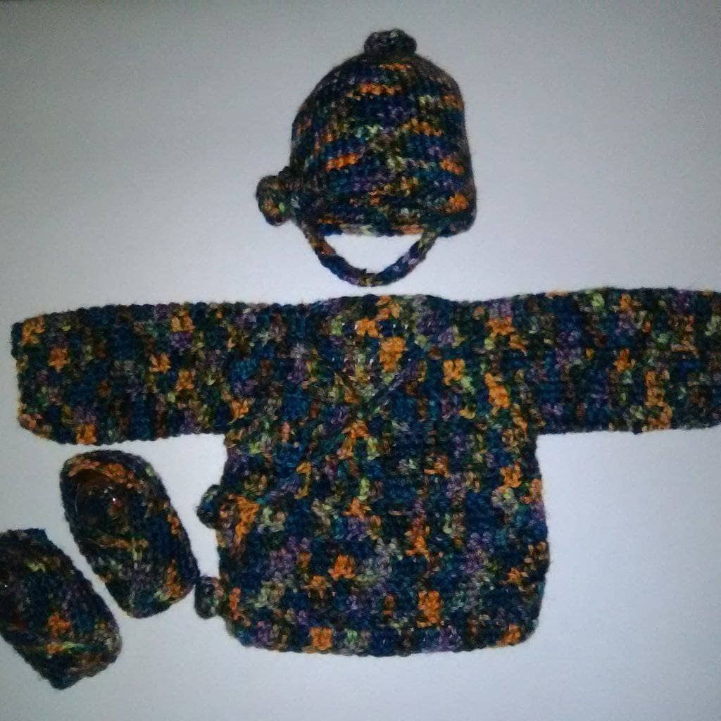 This Kimono-Style Cardigan is a cute way to keep the newborn in your life warm and cozy. Paired with a beanie and booties, this button cardigan set can be made for a boy or a girl.