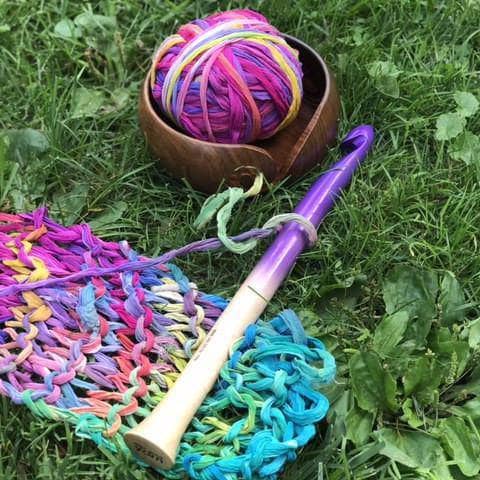 The best deal bundle contains a size 15mm ombre hook, 1 yarn bowl, 1 skein of silk chiffon ribbon and a FREE PATTERN.