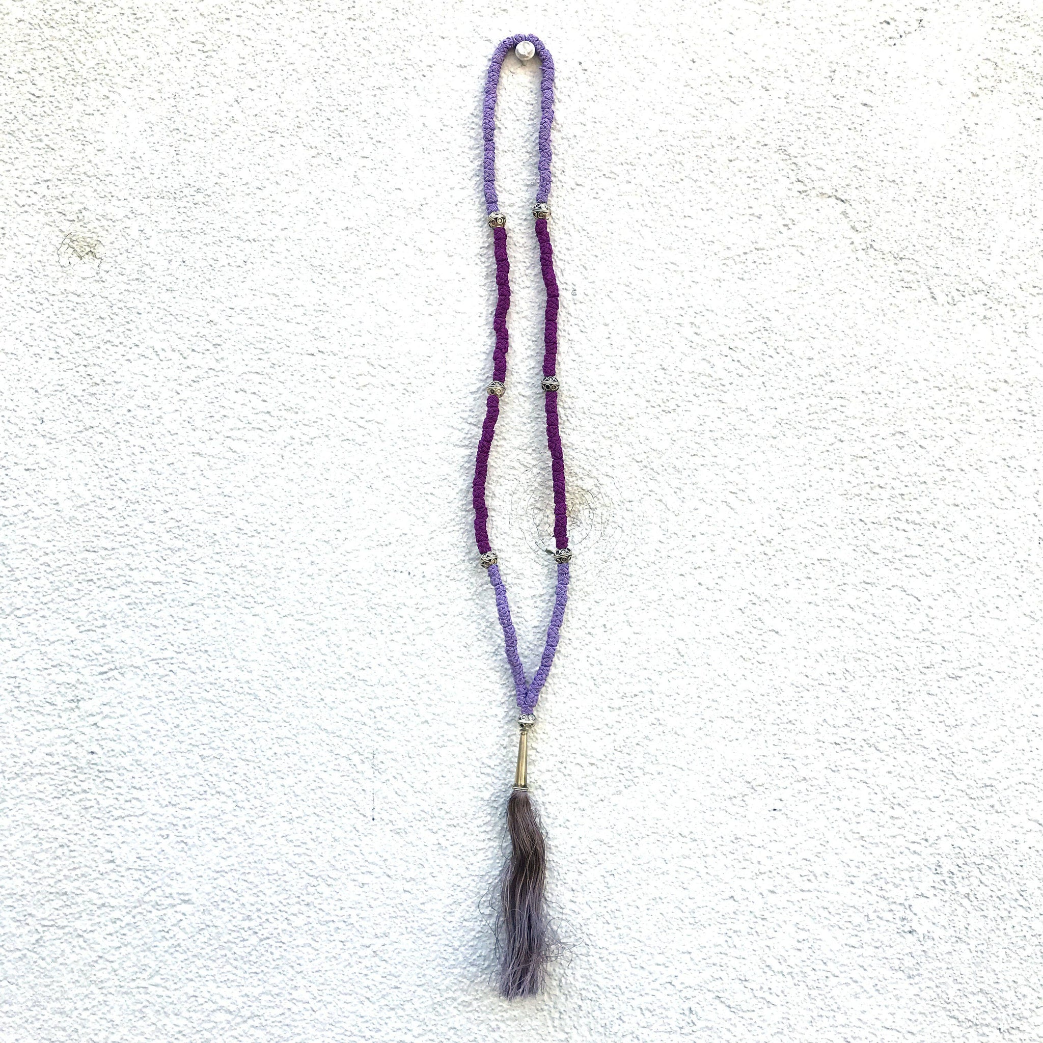 These prayer bead necklaces can act as meditation beads, yoga beads, or prayer beads. Handmade by the ladies of the Flying Camel Training Center in Morocco, this Mushmina design is the embodiment of beauty. Intricately made buttons are strung with vintage metal beads and finished with a handmade silk tassel.