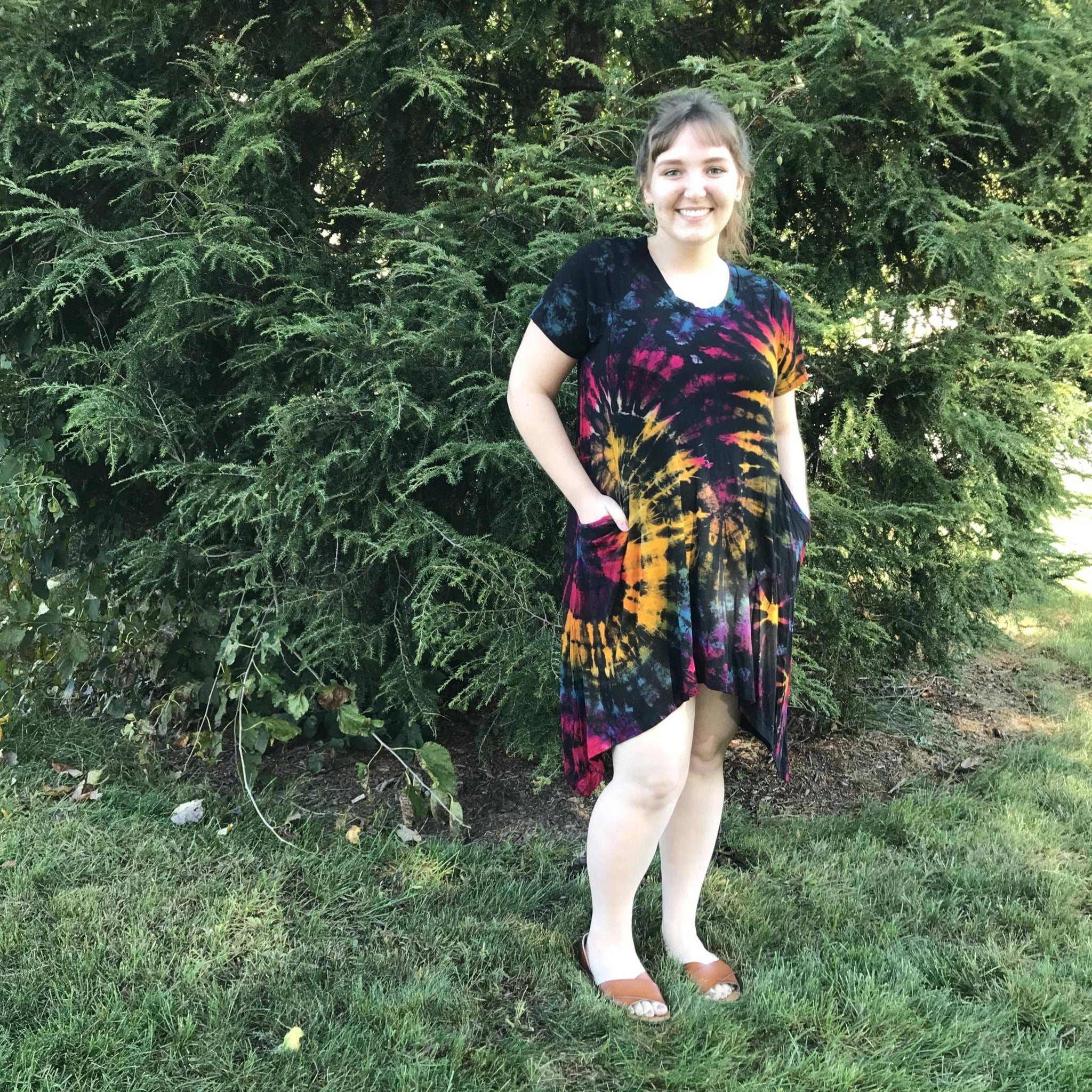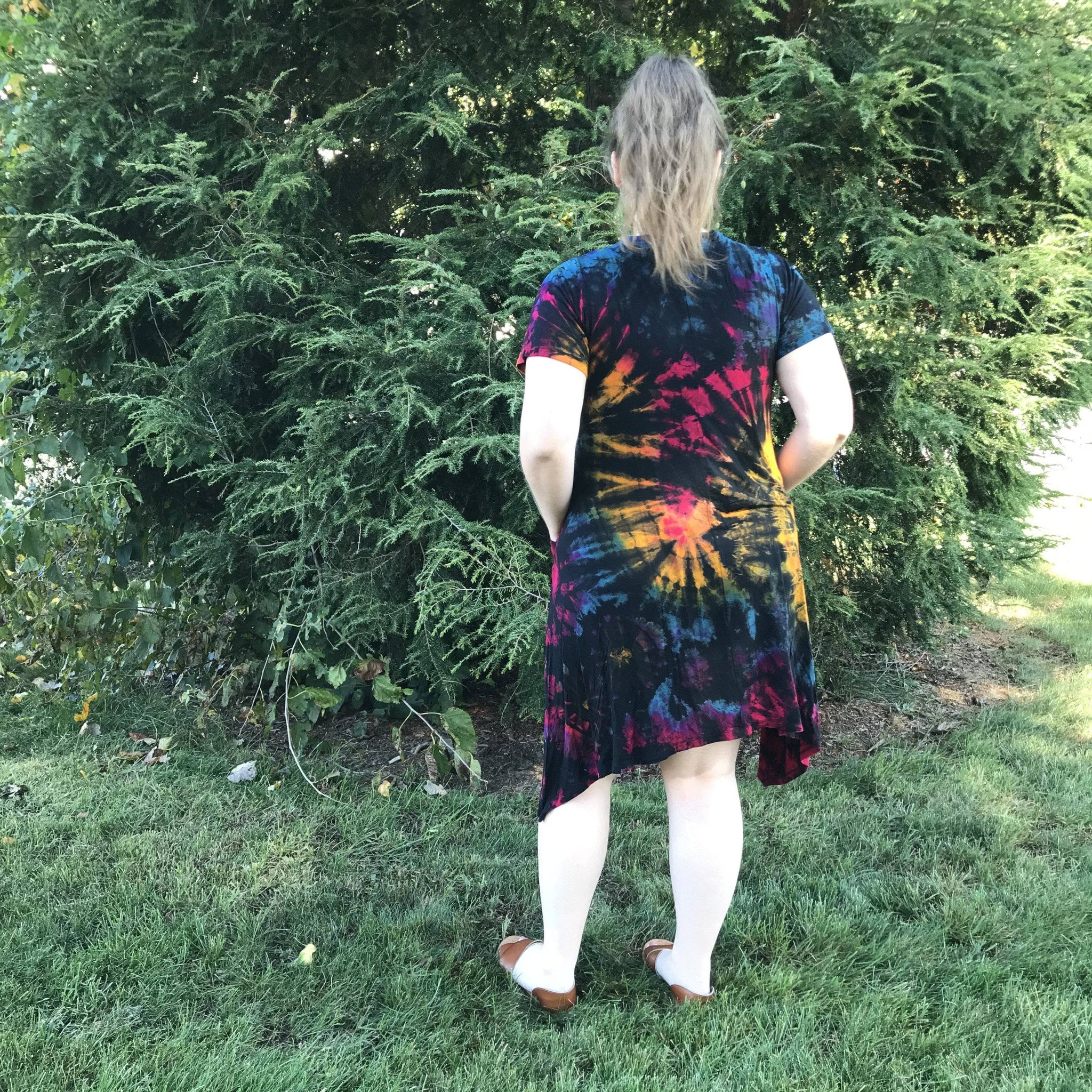 Embrace your inner hippie with this Short Sleeve A-Line Tie Dye Tunic Dress. Each dress is one-of-a-kind due to them being hand dyed. The garment is a Rayon/Spandex blend, giving it a lot of stretch and bounce. Warning, you'll fall in love with this dress with its comfortable pockets!