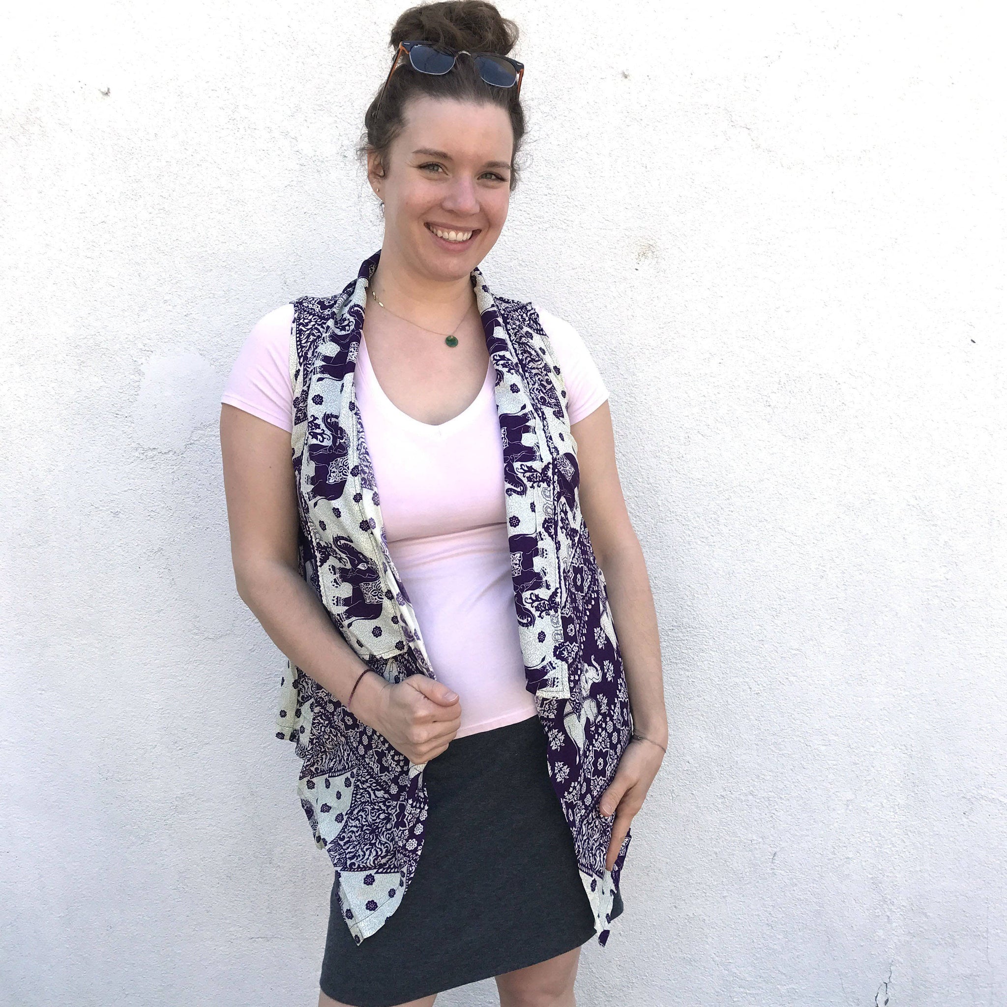 This Sleeveless Breezy Elephant Kimono has a subtle cascade open front, and is longer in the front and a bit shorter in the back. Perfectly flattering for every body type. The versatile design makes it a great staple item, and can be rolled up and put into any sized bag.