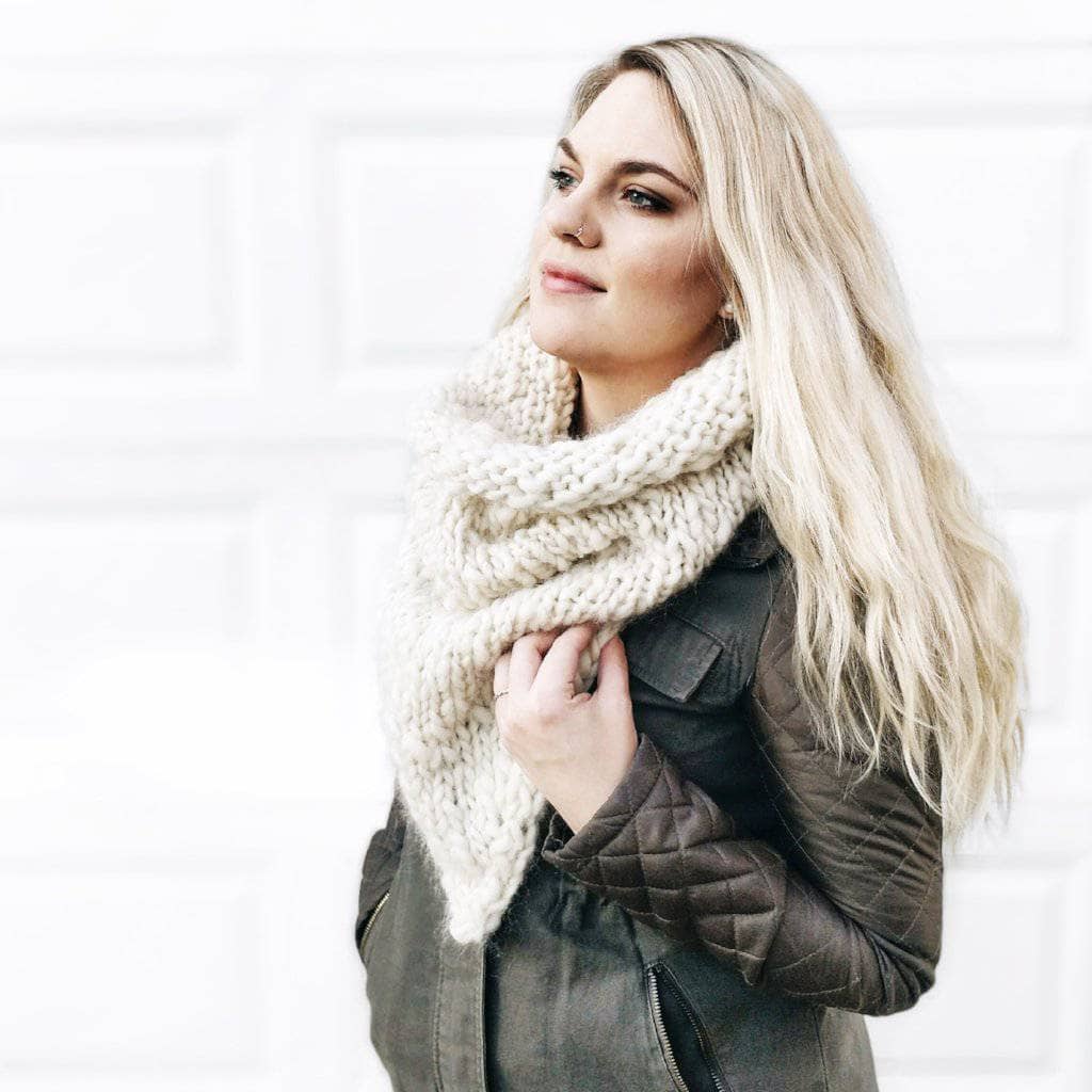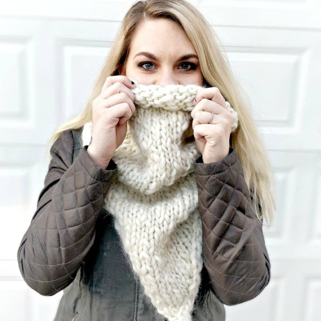Soft. Simple. Stylish. This cowl design is a super fast project that is perfect for any beginner knitter. The straight, matching edges will be seamed together to form the tube, making this one cozy cowl! This scarf can also be made with or without fringe. Each kit comes with 4 skeins of yarn and a pdf downloadable pattern.